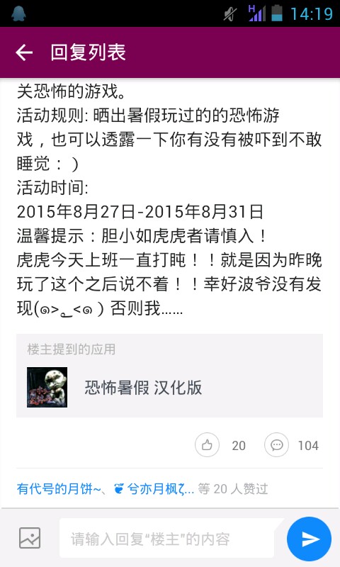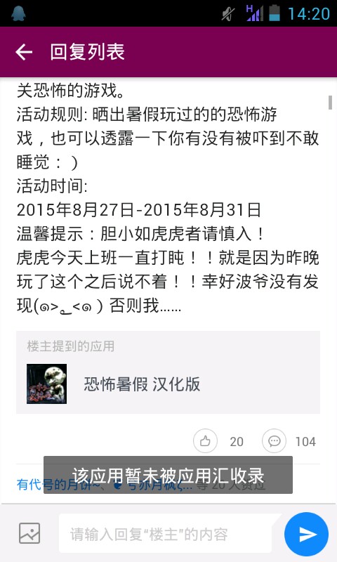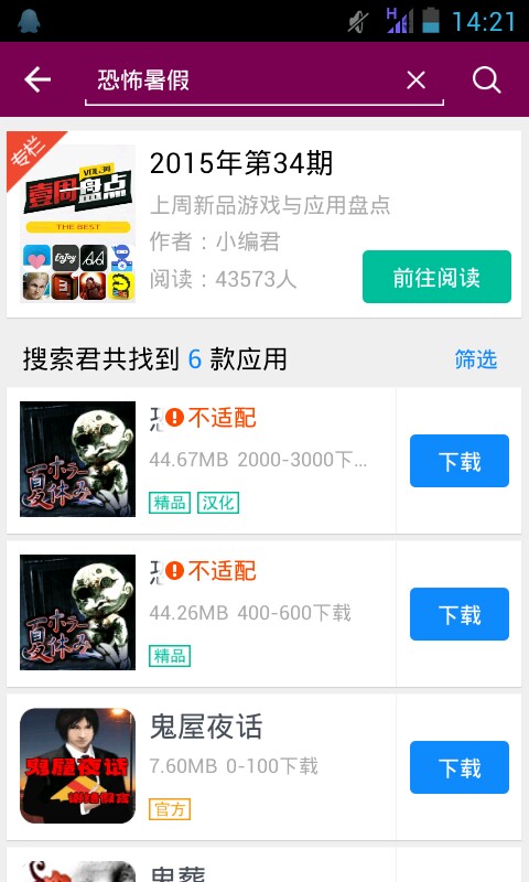 搜索君,我还有事情要说,就是我的手机与游戏:恐怖暑假不适配,于是我打开周四的汇汇恐怖游戏专栏里的恐怖暑假界面,就直接显示“该应用程序尚未被应用汇收录”,但是搜索中可以搜到。那样的话,出来这个“该应用程序尚未被应用汇收录”提示会不会太别扭了?