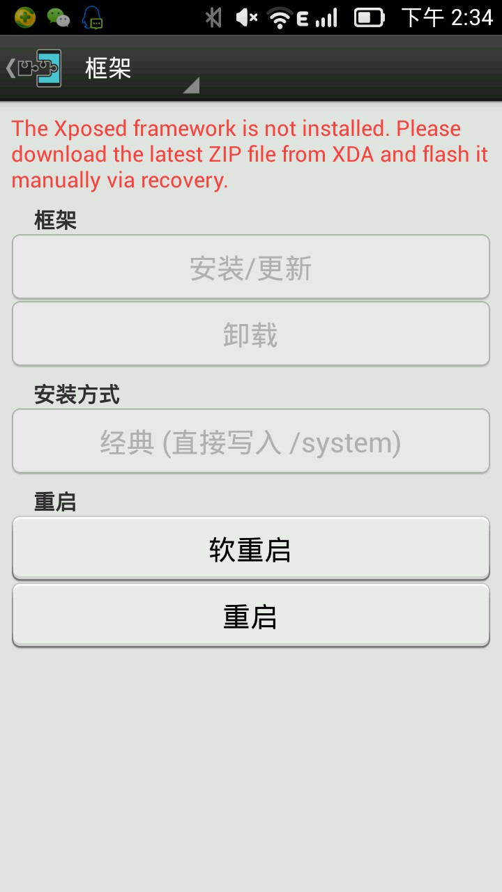 3.进入xp框架,点击模块,点选fs变色状态栏,返回,点框架→安装/更新,让xp获取root权限,完成后,重启,一切ok。