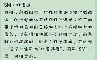 S是施虐者,M是被虐者,S一般处于很主动的状态,而且是喜欢虐待别人的人,M一般处于被动状态,而且喜欢喜欢被人戏弄或鞭打或殴打或毒骂等等……因为会感觉很爽,例子:天子(M子)