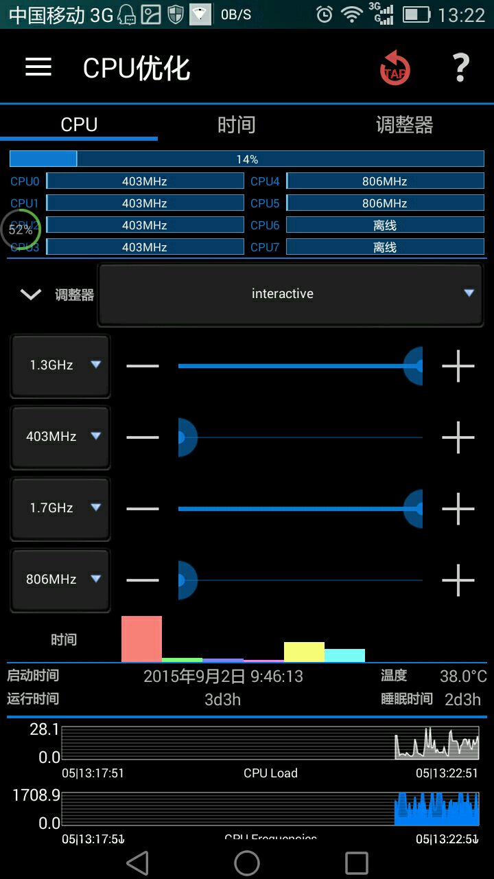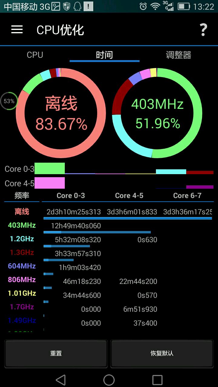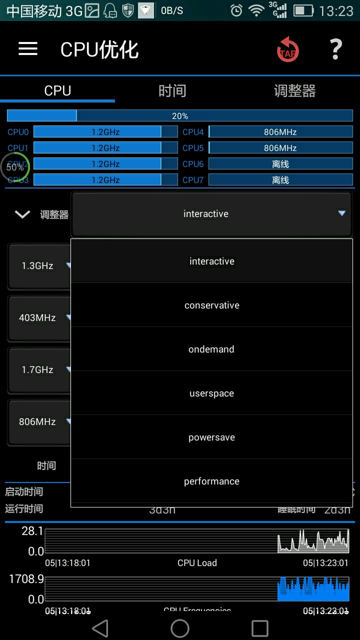时间页:查看CPU工作情况(不是使用情况,APP的CPU占用貌似在电池管理),便于设置适合的CPU模式与工作数