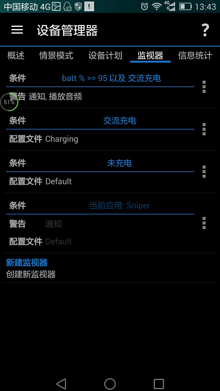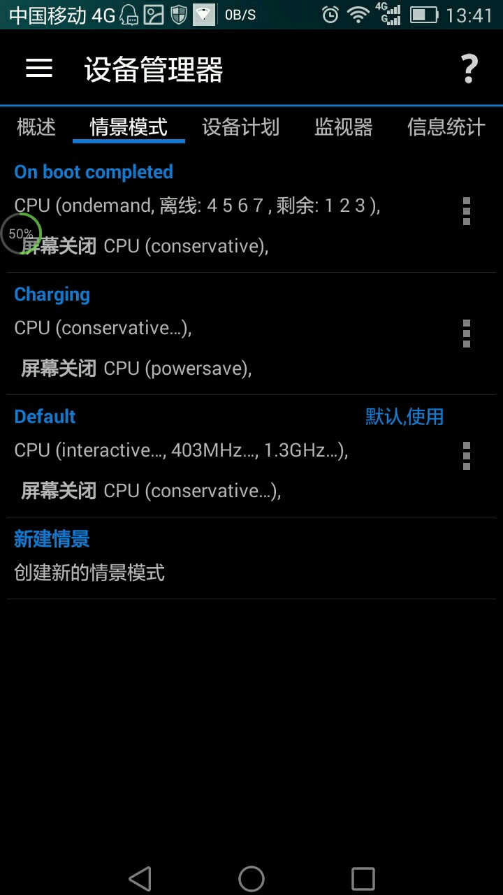 四行四列,楼主也仅仅有精力使用其中三个版块——电量管理(相当于以前的battery monitor)、CPU管理(system tuner的CPU管理单独分出来加强版)、设备管理(自动情景模式,监视器,设备计划之类的)。另外温馨提示,终端模拟器可以从底层修改一些参数,比如设备显示分辨率。下面简单说一下这三个功能版块用法