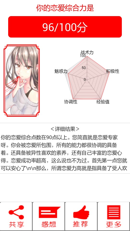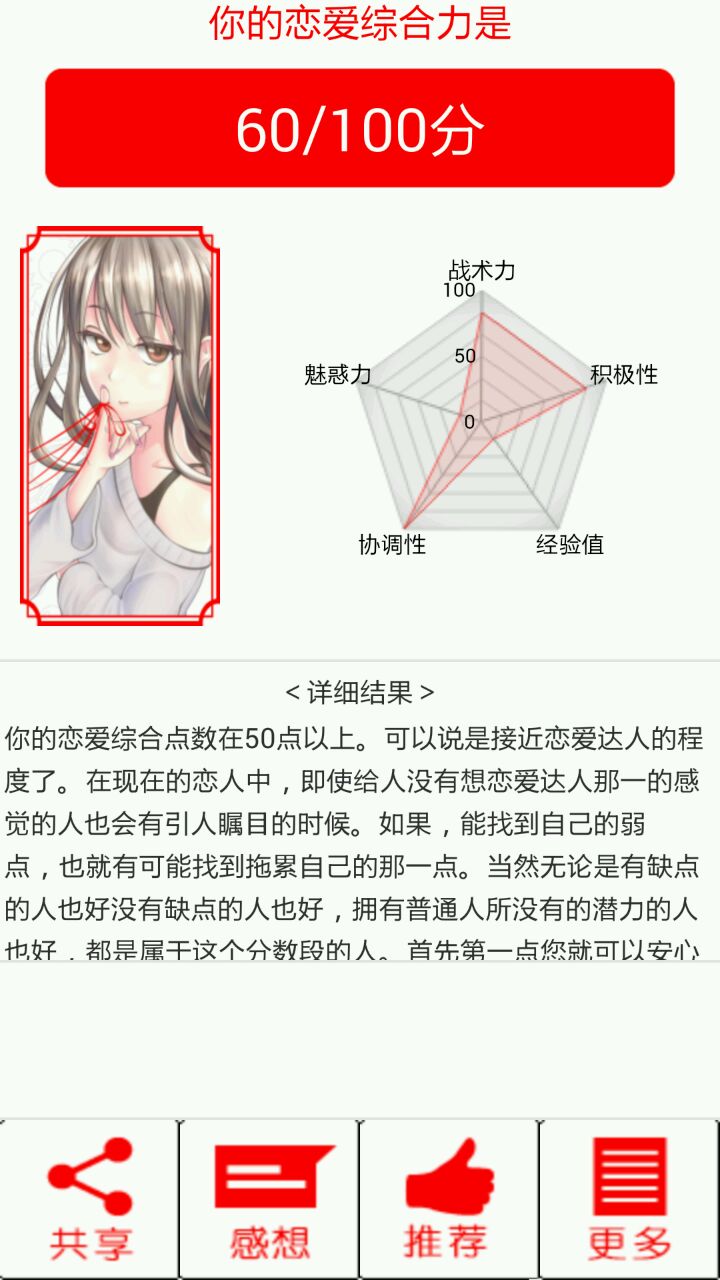 一通测试下来对自己的恋爱力没什么感觉,反倒对制作者判断恋爱点数有了了解。测试的时候选项只要大胆一些,开放一些,主动一些,70分以上没有问题~反之如果选择的选项羞涩一些,胆小一些,分数就会变低。
