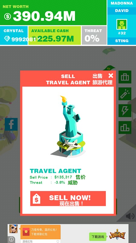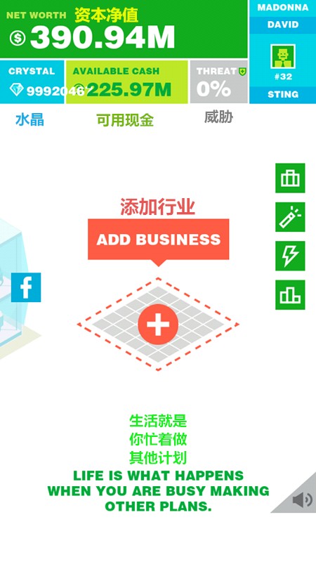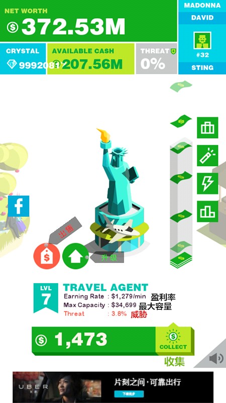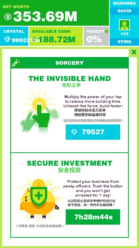 《亿万富翁》推荐&攻略这里先感谢 不愿透露姓名的XX 又给我推荐了一个游戏,虽然我觉得这个游戏有些无聊~《亿万富翁》是一款它给你$1000白手起家,你通过努力使自己变成亿万富翁的励志游戏~不过要我说,我玩这款游戏主要是因为建筑的风格超爱,努力什么的就用修改器代替好了(ㅎ.ㅎ)于是水晶数才这么逆天▼_▼这款游戏在你像我一样用了修改器之后就真的不好玩了,所以三思啊~不过我是为了建筑物才玩的,所以我就不怎么在乎了Ծ ̮ Ծ游戏都是英文,于是果然,评论区又有小伙伴说要汉化~不过这游戏还真不怎么需要看懂,也就几个地方~所以所谓【攻略】就是小小的翻译了一下基本涉及的地方~我对自己的翻译水平还是挺自信的_(:з」∠)_详见1楼