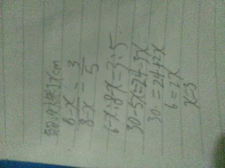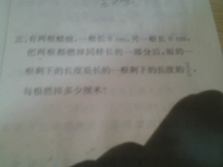 有两根蜡烛,一根长8cm,一根长6cm,把两根都燃掉同样的长度的一部分后,短的一根是长的一根的5分之3,燃掉了多少米?