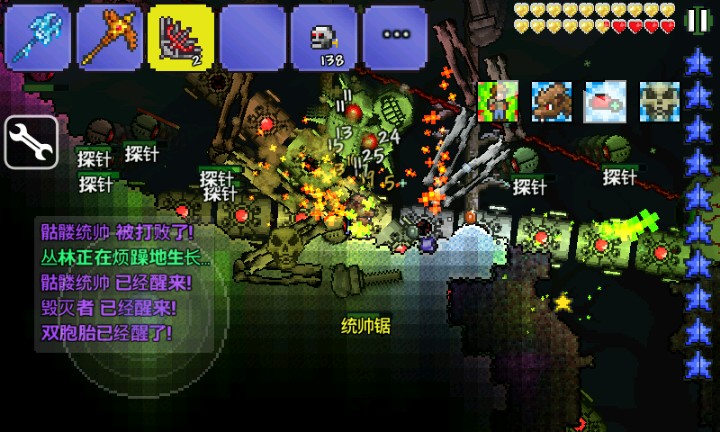 骷髅首领 防御至少40以上,用永夜之刃,注意走位,他转头的时候被硬拼。毁灭者 瞌个铁皮药剂用永夜之刃站撸。。。双胞胎 50防御都很难过,半血之后伤害高的一逼,,,石巨人 血月去树妖那买个闪耀之翼,用火焰投掷器边跑边喷,50防御的话只是时间问题。