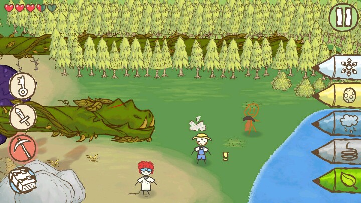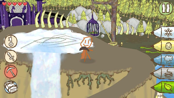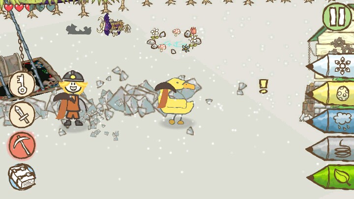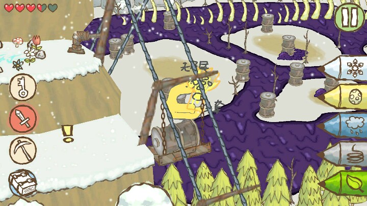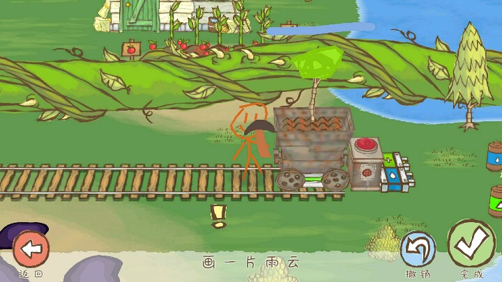 图三,顺着轨道走,看到矿车上有棵枯树,画上树叶,再画上雨云让树成长