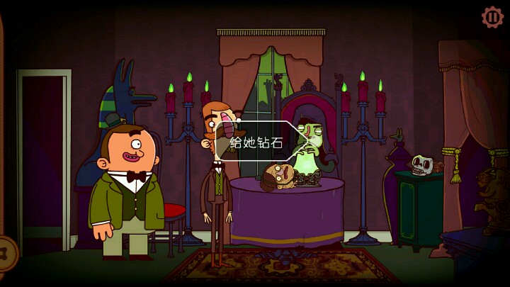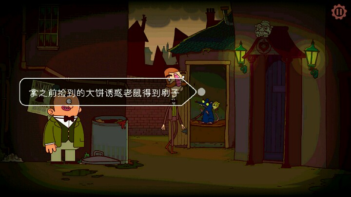 去找大老鼠 用大饼诱惑它出来 得到刷子 回到桥那个画面 把浴缸和扫帚放入湖里让独眼划到对面去 然后放下桥 向前走 用刷子裹上蜘蛛网 在门口碰见小孩子看见眼睛 得知他们要珠子 然后进屋 拿起珍珠 然后走向粉底 把之前裹上蜘蛛网的刷子涂上颜色 点击柜子 然后把 上色的蜘蛛网刷子 给两个小孩 得知他们爸爸胡子是假的