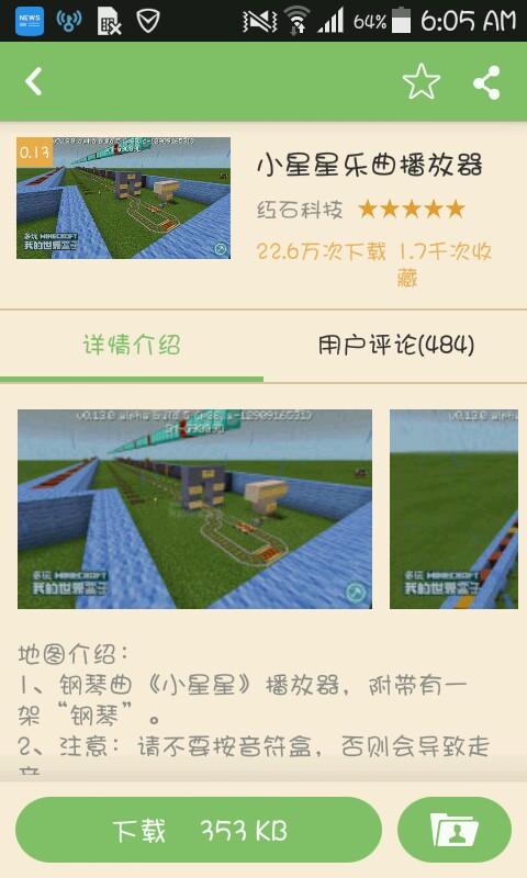 此图由本人亲自制作,制作时间为1天,测试并修改了无数回,实现了误差小的红石小星星音乐。使用此图时请不要点击音箱,以免破损音质。开启后请沿着开启的红石灯飞,以享受最高音乐品质。此图未经本人允许,禁止转载!!![1楼链接]