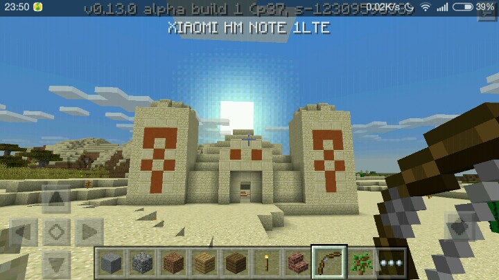 大家有没有还记得我的,今年暑假时我在汇汇里很活跃,开学后就再没关注过,昨天听人说pe更新红石系统了,立即下载,结果发现还有很多东西没出,比如中继器,活塞,比较器。不过已经很不错了。红石什么的我在这里不做说明了,众人皆知。而b1加入了一个自然生成的遗迹,那就是沙漠神殿。这是一个只会在沙漠生物群系里出现的建筑物,下面附图。