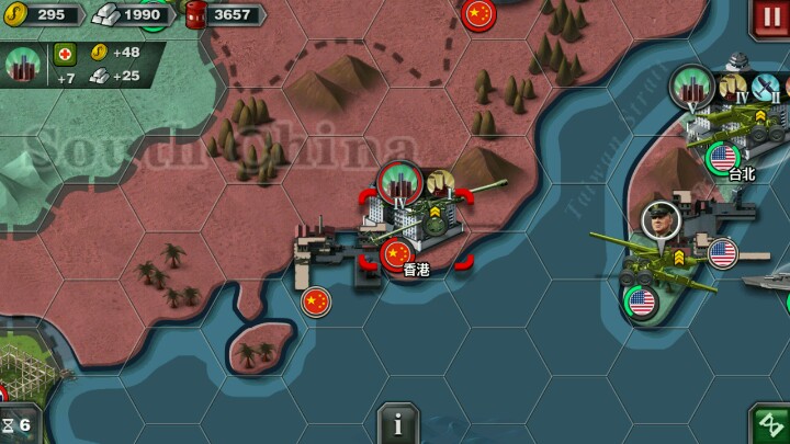 首先吧,老惯例,太平洋和西海岸的军队通通到日本来拖延中国的扩展,尽量造核武,开始没回合不用造兵,欧洲方面先让盟友们支撑会儿,到苏联消灭比利时时就可以造兵去欧洲,多出来的钱造核武,在菲律宾发射导弹+核武,然后菲律宾空降香港,就能占领香港,再用菲律宾导弹+核武轰炸上海,再用香港空降上海,以此类推,就能占领很多城市,每回合记得更新军队,否则还会让中国方面抢回来,造装甲车比较好,然后等级高一些的造重坦克,不过派一辆重坦克占领原国民党城市,然后每回合野战炮,逐步推进可以占领重庆,如果武汉能造就在武汉造,然后上海空军轰炸其他城市,最后很容易占领中国大部分城市,然后每回合在重庆和北京造超级坦克,重庆方面的坦克进攻泰国和中东,北京方面的占领蒙古和苏联远东地区。日本的偷城,然后把中国军队拒在海上。