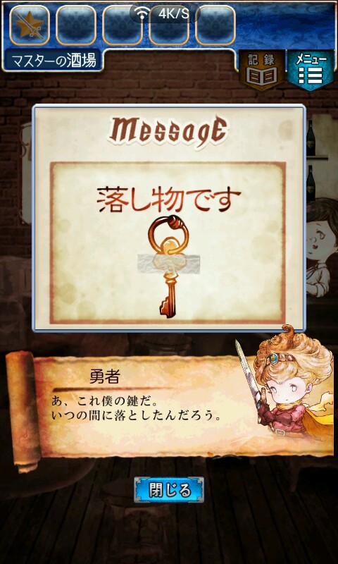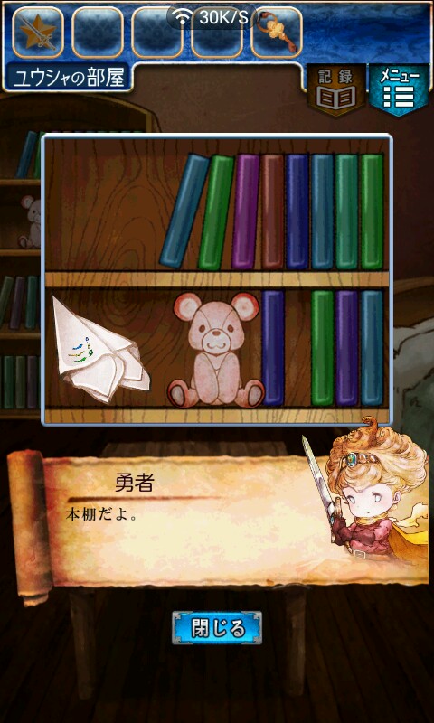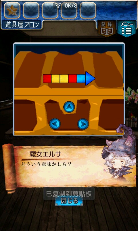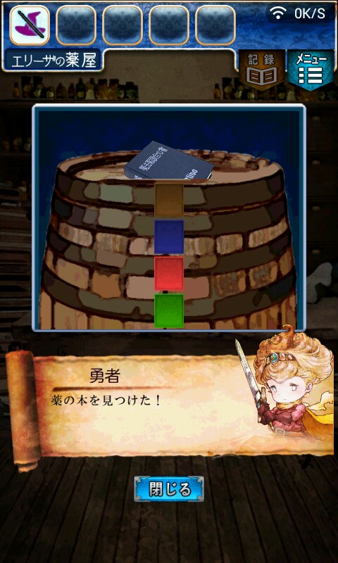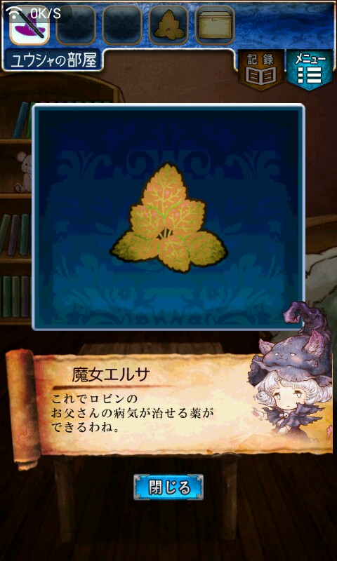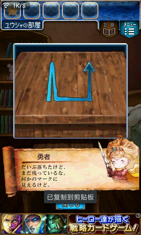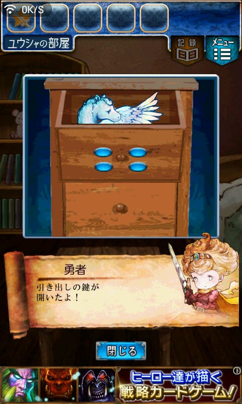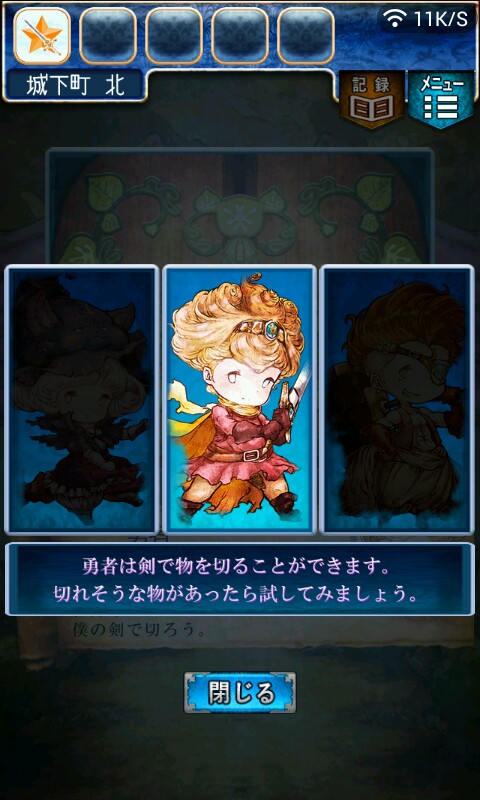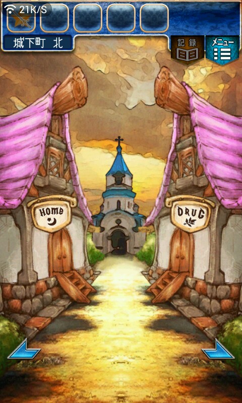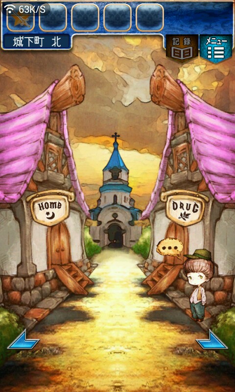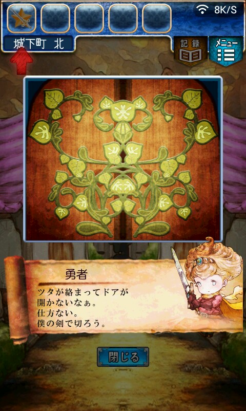 第一关,首先我们在ユウシャの部屋(勇者的房间),点中间红色箭头下面的蓝色箭头,来到城下町北,之后在右边上面挂着drug牌匾的房子(魔女的家)门前会有一个红色箭头,点击魔女家的门,发现门被树藤缠住了,之后我们道具栏第一个格子会有一个红色箭头(英雄切换栏),点击点我们的勇者,之后点门,勇者会砍掉门上的树藤,点门过关。