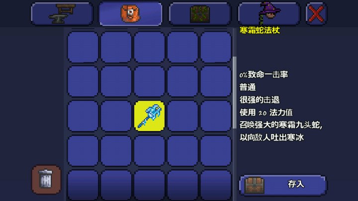 做寒冰钥匙,到地牢看到一个蓝色的宝箱,解锁可以在里面拿到地牢五神器之一寒冰蛇法杖,可以召唤一个蛇炮台帮你攻击……