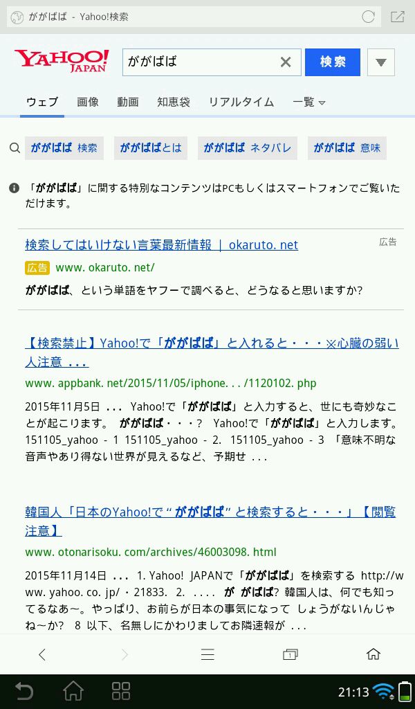 在浏览器中搜索“日本雅虎”,然后找到一栏标有“官方”的网页,然后进去,搜索“ががばば”然后就会自动进去一个网站,过一会就会弹出一个窗口“发现有不明意义的声音文件,是否开启?”第一个是开启,第二个是无声开启,第三个是不开(如果有人不相信,但又害怕是真的的话,就推荐你选第二个),选完以后就会十分诡异地在搜索那一栏出现一串日文,然后自动点了搜索,接下来就等着有人来敲你手机屏幕吧!(胆小的人千万不要常试!负责后果自负!)这个都市传说不推荐尝试!因为在日本雅虎官方已经说明了禁止搜索“ががばば”!也就是说雅虎官方可能也不知道这件事!如果你们想尝试!就不要怪我没提醒你们。2楼发直连