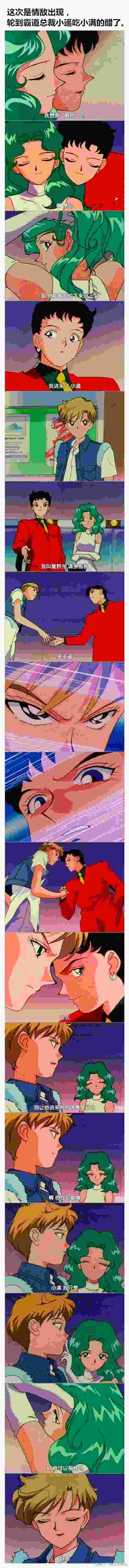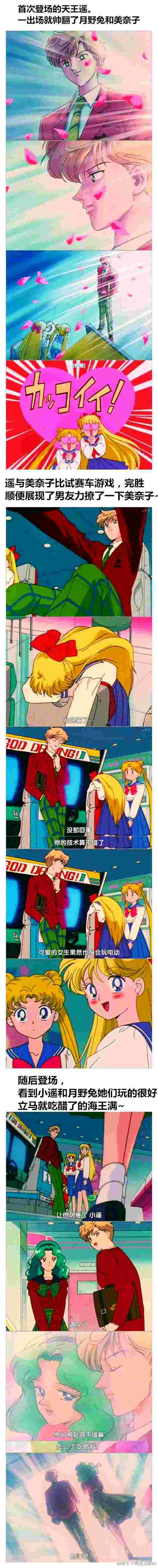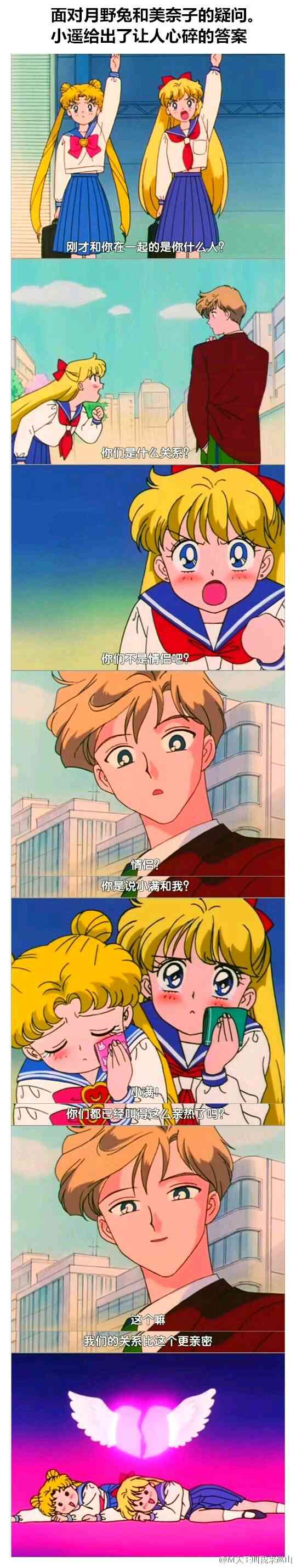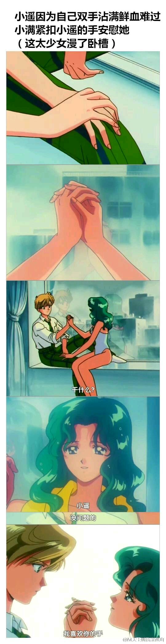 真是可怜,你可以自己去搜下美少女战士天王遥和海王满。你只要知道,她们都是女的,小遥长的很帅直接就是画作男读作女的,她们一直在秀恩爱就对了