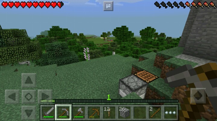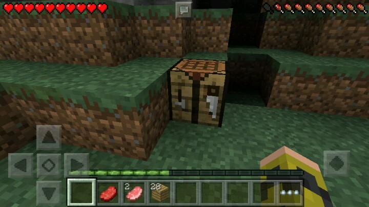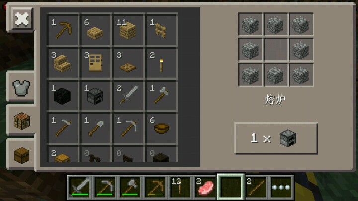 看见了山到那里去发展还可以有多一点的资源(呵呵呵。我要去当山大王)把挖来的木头做成工作台(四个木头做成的)挖煤挖石头。。基本装备图四