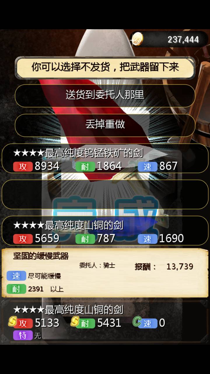 1.这游戏有个不大不小的BUG,二楼会上图证明,也就是即使你的钱不够副本的入场费,但是你仍然可以进入副本。最开始我为这个特别欣喜,因为我玩的时候有看到有人说BOSS不要通关,留着打材料……但是每次入场费又比较贵,这样我就可以省点钱了!对此我要纠正这个谣言:打材料什么的,基本上好的材料打到后面,副本小怪爆的全都是之前boss爆的,所以也不需要刻意不打boss。而且很重要的一点,打boss耗费的武器耐久最少是小怪的3倍。也就是一把耐久600的高攻武器,打boss可能3.4刀就断了,但是打小怪推图可以打死好多个了!所以个人建议是boss能推就推了拿加成,毕竟开始就想拿好材料,格子不够用了也比较浪费。实在要拿我也只建议拿一把耐久超高,攻速能好点就尽量好点,然后素材全用素材发现花给堆到高等级的去刷。