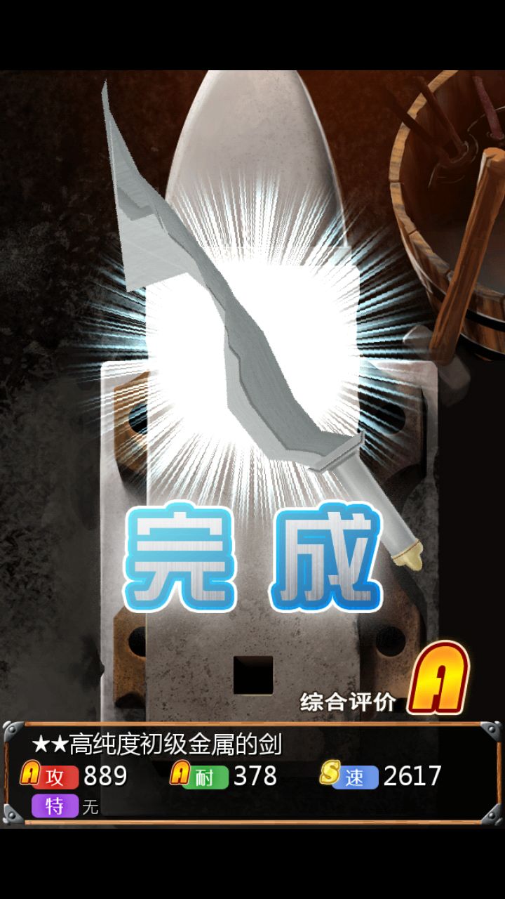 我的个人打造顺序一般是这样的:先点击左边,也就先打刃,从下往上一路狂点,这样可以同时增加攻击力和速度,点到剑长到需要拉长了看的角度,然后换右边开始打刀背,增加耐久,一般这样打完,武器基本都是a,至少有一个s以上的属性,!至于打s武器的重点:弧度!弧度!弧度!重要的事情说三遍,如果你能把剑打出弧度,如我的那三副图,都能看到,尤其是后面两副,再加上那么一点运气,那你就有可能成功了!(如果我这么说了然而还是不懂,一个最简单的方法,照着那三副s的样式打,一般基本也是a)
