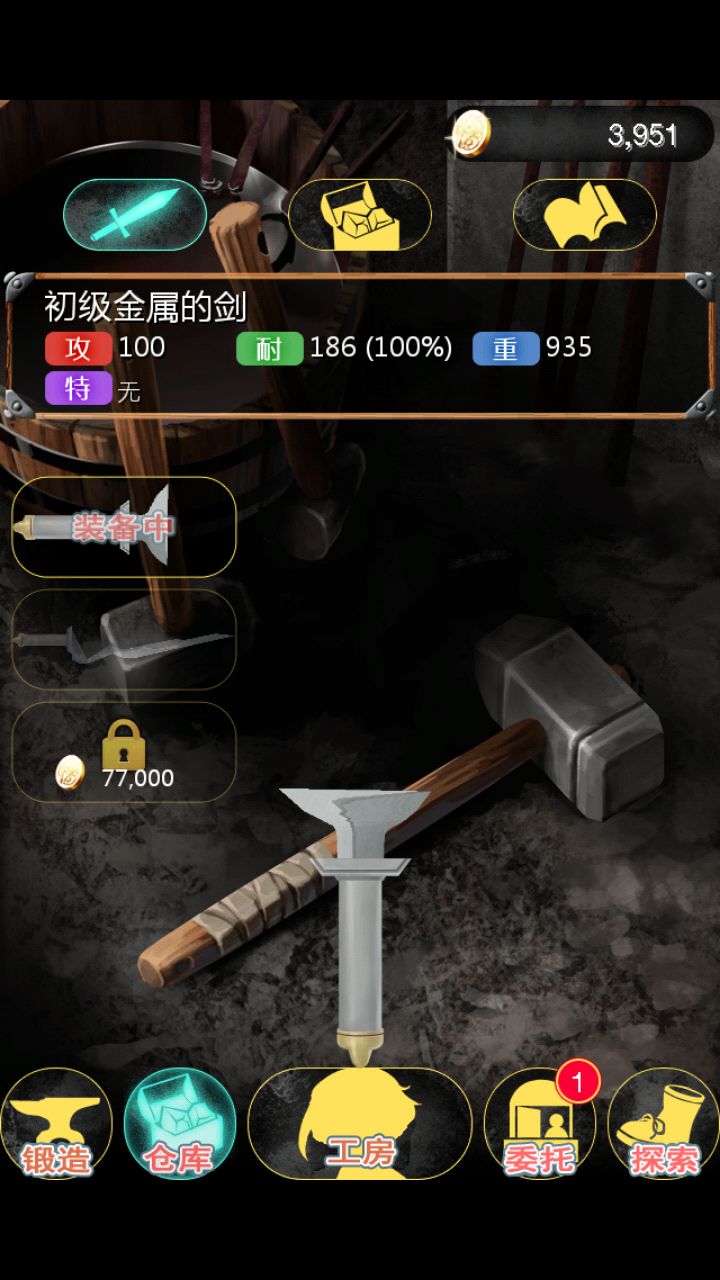 3.终于到了武器锻造攻略了!恩,其实打造武器这事,运气经验缺一不可!我也打了很多其他感觉还不错的武器,总结了下经验,这游戏基本上往左打是打刃,也就是武器的攻击力,往右打打背,也就是耐久度,往正中间打会左右同时增加,想把武器打长增加速度,我的习惯一般是先打粗一边,然后手在最边上点击把粗的地方重新打细,那么长度就会增加了!当然也可以直接在边上打长,但是这样剑就会变得太细,虽然攻击速度都很容易达到s,但是耐久会变的惨不忍睹。(特别注意:我说的打的方法都是沿着边一路从下往上敲,如果不是做那个女汉纸的任务,敲一定要注意不要一直点着一个地方不动)
