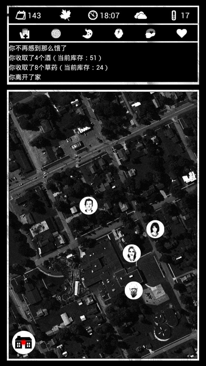 4.当饱腹感在一半以上时,心情就不会变差,然而其实我感觉后面心情降为零后并没有太大的影响(毕竟用枪后僵尸能摸到你的血就很少很少了),不过前期那些生命回复还是挺重要的,毕竟要用斧子撸僵尸。