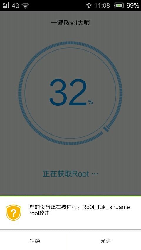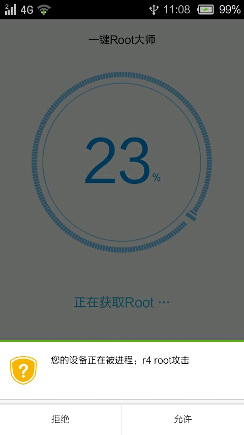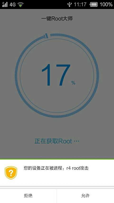 (4) 联网,打开一键root大师,点击开始root,然后大返回 ,回到桌面,进入:设置,到安全中心的界面(或直接长按HOME键,进入设置任务,到安全中心,强行关闭的页面),一直允许屏幕下方的攻击进程,直到允许busybox进程后,迅速点击强行关闭并确定,按左上角<返回,再进入强行关闭,快速执行3次。注意:在强关的过程中也要注意允许屏幕下方的攻击进程。