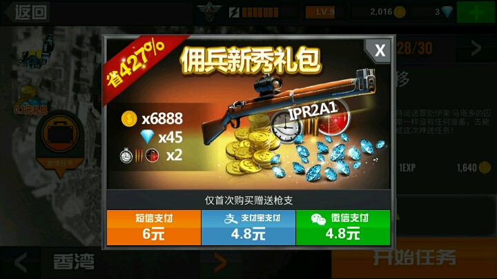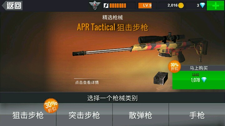 还有,我不得不夸赞这真是一款狙击游戏,四种枪每个上面都有狙击镜,还有啊,第二把枪就要我130多钻石是不是太耀眼了些?