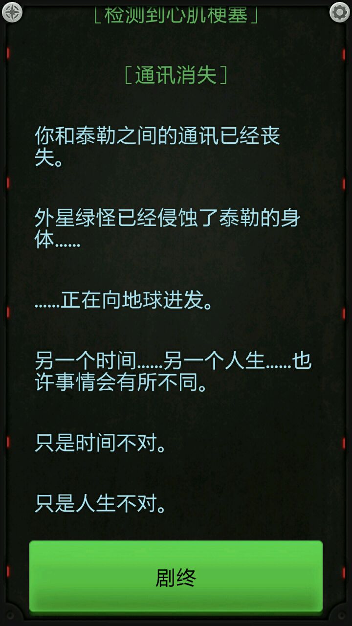 首先在这里感谢全体制作人员的辛勤劳动是我们能够在手中的手机上与这个叫做泰勒的倒霉孩子一起笑,一起哭,一起紧张,一起感动,就像我们就是泰勒自己一样。其次第一作和本作构造了一个深邃而神秘的太空体系与紧张刺激的求生环境,而结束时的话语也引人深思:只是时间不对,只是人生不对。对于我们每一个人来说,时间带着人生一去不复返,在所有的不确定性当中我们存在于这个世界上,正如这种文游的特点一样,每一个选择都决定着主角的命运。而现实生活中,我们所做的每一个选择又何不决定了我们自身的命运呢?