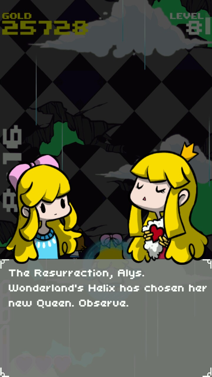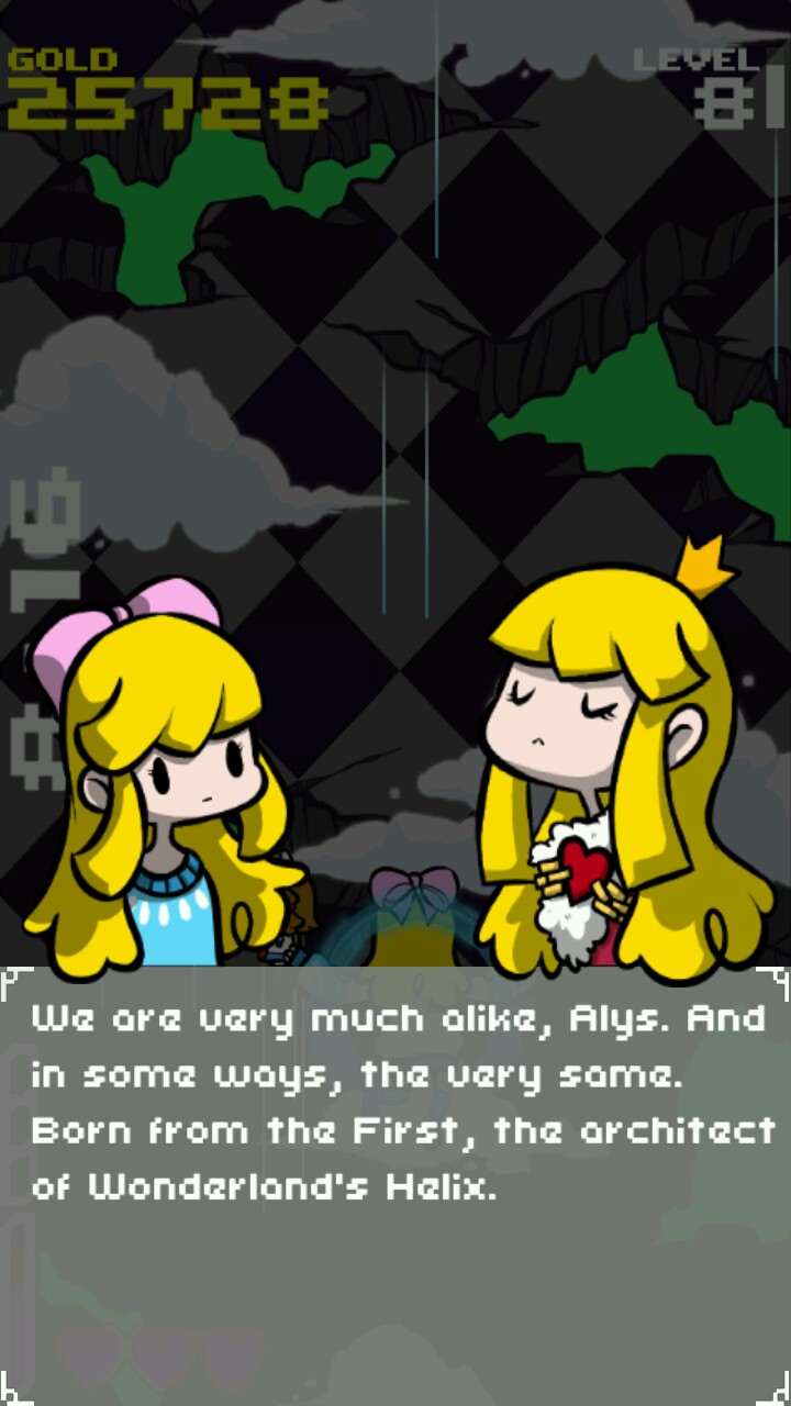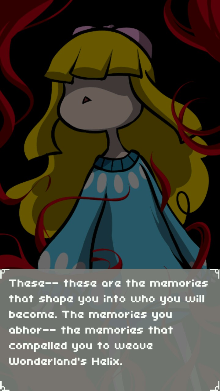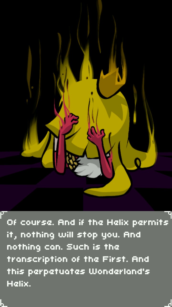 从二楼开始: 欢迎回家,阿里丝,欢迎来到完美大陆星云Helix 呦你看起来像我!你…你是谁? 我是阿里丝,不然拥有这张脸? 妳是…女王…?但为什么你拥有我的脸? 三楼: 你全部的问题将在一会后揭晓,亲爱的阿里丝 我们有很多共同处,某方面甚至非常相同,从最早开始,完美Helix星云的建筑师(看不懂啥意思) 你这是甚么意思(看来他也不懂),这…这个地方怎么了? 在复活,阿里丝,完美Helix星云在选择新的王后,观察(不知道是名词还是怎样)