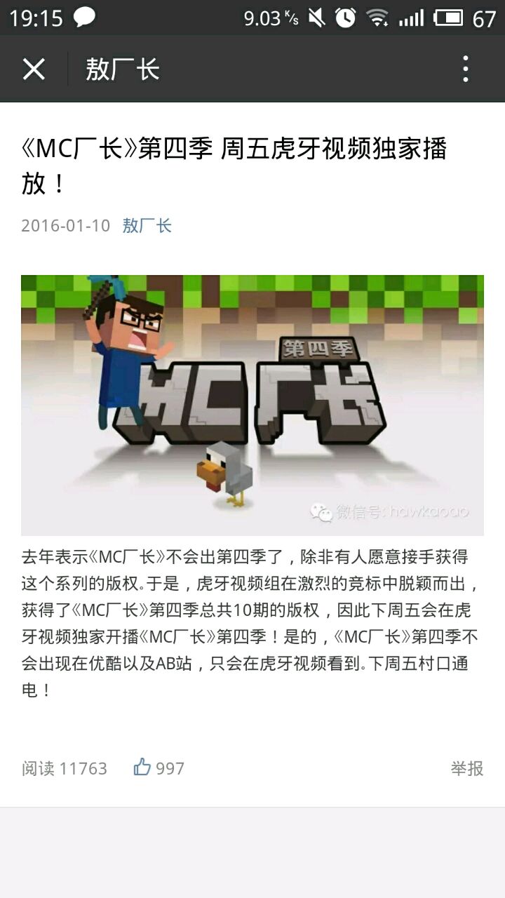去年表示《MC厂长》不会出第四季了,除非有人愿意接手获得这个系列的版权。于是,虎牙视频组在激烈的竞标中脱颖而出,获得了《MC厂长》第四季总共10期的版权,因此下周五会在虎牙视频独家开播《MC厂长》第四季!是的,《MC厂长》第四季不会出现在优酷以及AB站,只会在虎牙视频看到。下周五村口通电!(只为熬熬!!!!!)