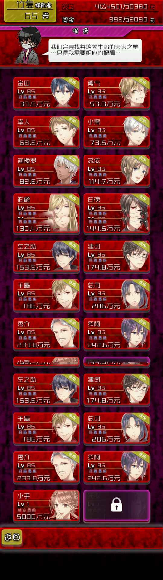 第一种牛郎雇佣,里面雇佣牛郎需要一笔资金,每次经营后需要工资供给,越玩到后面牛郎越厉害,还可以给自己的牛郎升级增加能力值。