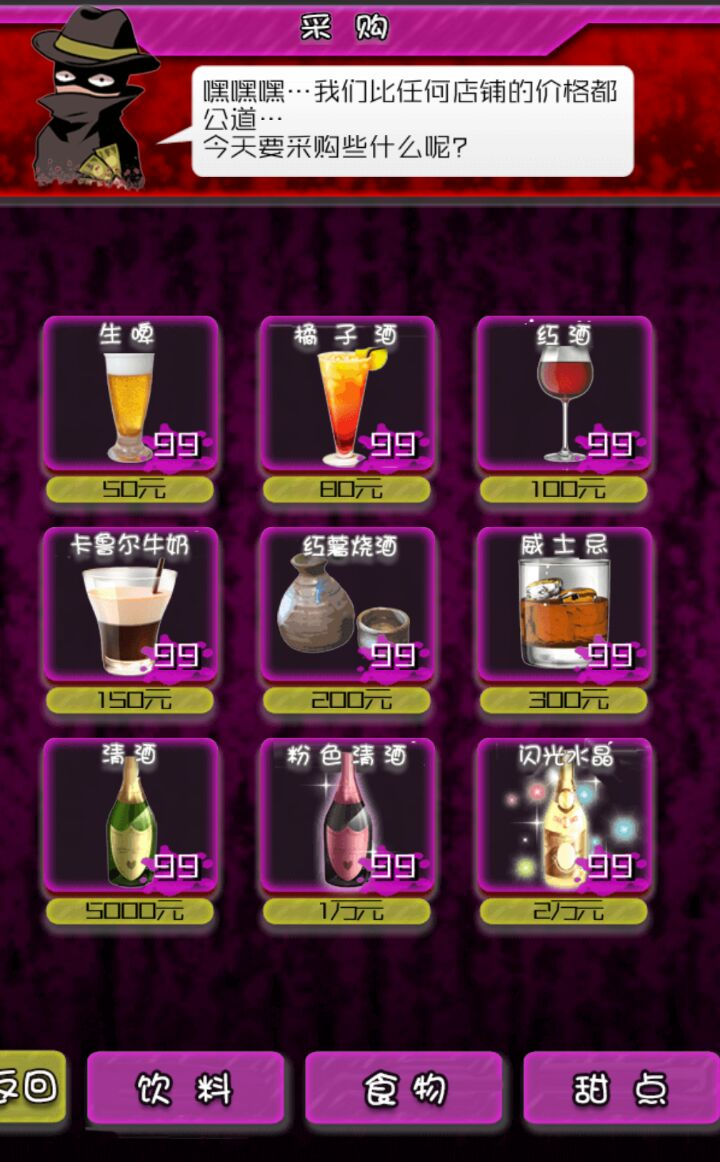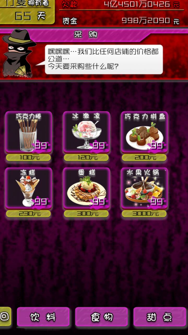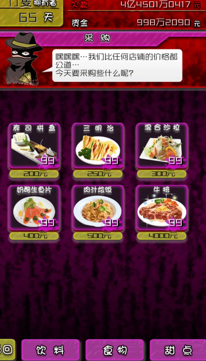 第三种是食物购买,经营的时间越长得到的食物品种越多,卖出的价格越高,食物在经营过程中有消耗,需要自己购买储量。