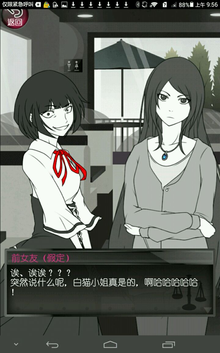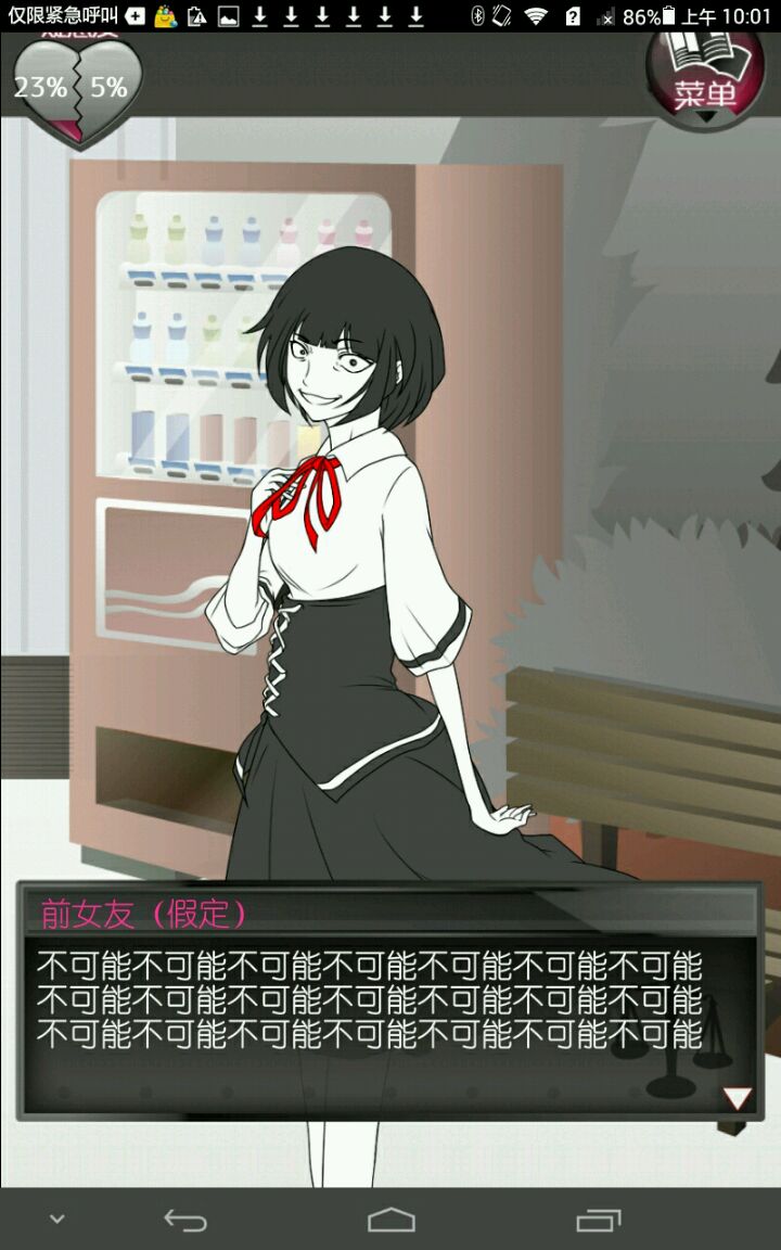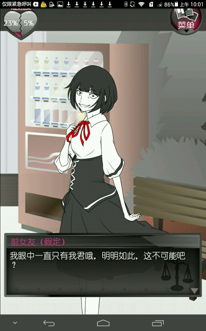 首先这不是个恐怖游戏,但我真的受到了惊吓,bgm简直吓人。前期本来觉得前女友还挺可爱的,到了后期一看见她就有种不好的预感,各种刁难男主。关于怀疑度,我个人一直把两人的怀疑度控制在20%以下,打通结局的时候前女友14%,现女友0%(听说这游戏会影响结局)最后我打出来的几个结局,全是暴力结局,还有那个前女友暴力结局真的吓哭我了。。。病娇真特么可怕,我还是比较喜欢现女友这种正常人
