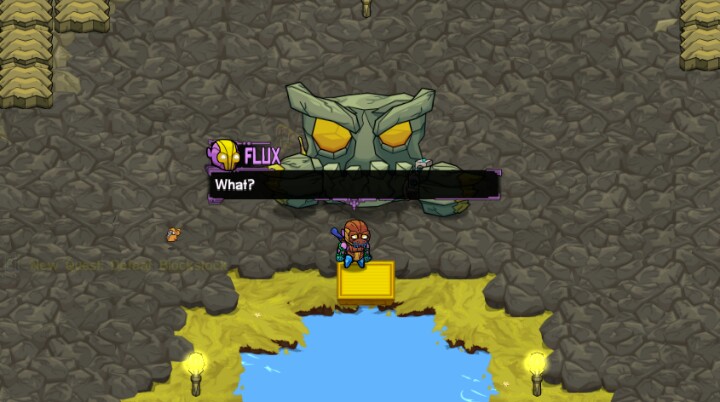 那里有第一个boss,一块大石头,在那个三角形的三个角有三块绿色的石头,先从最上面那块敲碎,然后右下在左下