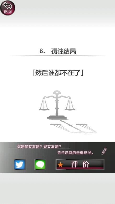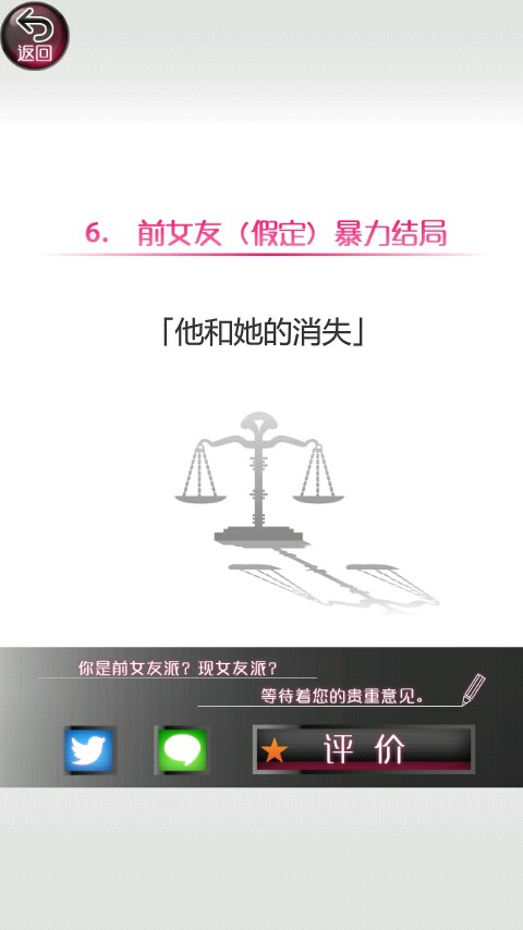 第六个结局一样是现女友暴力结局。也是两个疑惑值都在50以下时(有一个或两个在10以上)选前女友。你去向现女友谈分手时,她哭着跑开。然后你以为你会和前女友幸福生活,然后一个星期后,前女友被现女友所杀!(哎呦卧槽都是死)