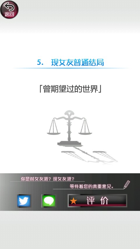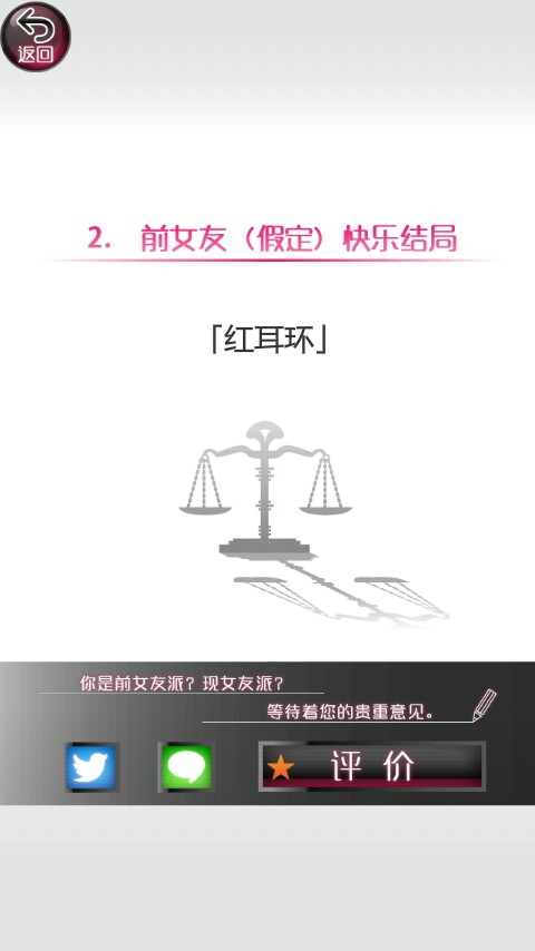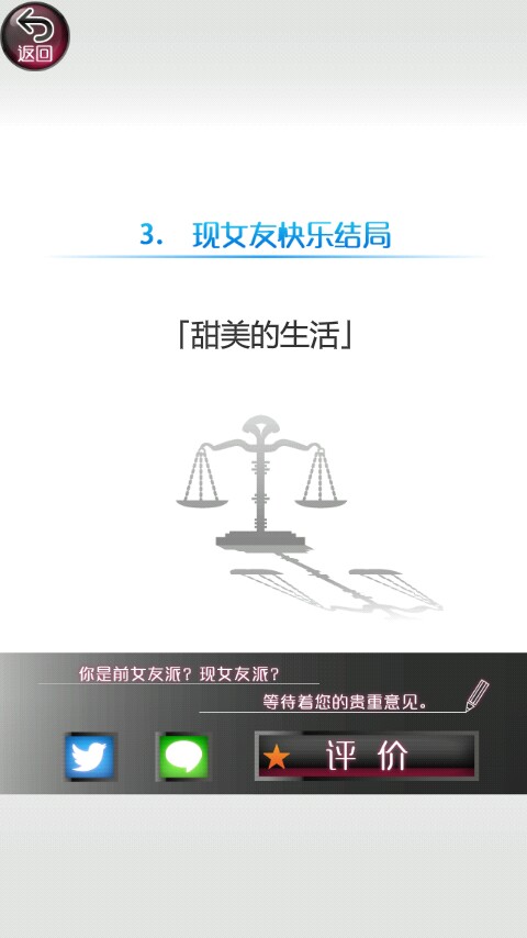 第一个结局就是两全的快乐结局。这个结局做的时间最长估计有两三遍,只有两个人的疑惑都低于10才可以,几乎是要完美通关。你在两个疑惑都低于10时会发现多了一个选项,你就选那个“两个都不选”的选项,你会打电话把她们都叫来,向她们坦白,承认自己是渣男,然后她们气着要离开,这时你去追她们然后突然摔倒(苦肉计吗?)最后醒来发现她们都在照顾你,最后上演二女争夫的剧情。(喜闻乐见)