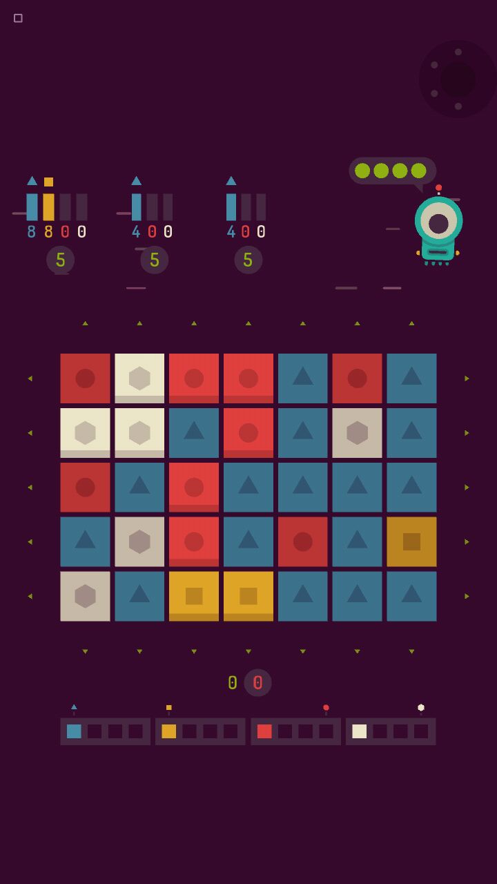 ④上面那排小怪兽和要求的小方块规则很有意思。小怪兽有四条生命,每组小方块有步数,步数为零后还没有消除完的话,消耗小怪兽生命。一条命使小方块需要数减半,小方块<8块直接消除。