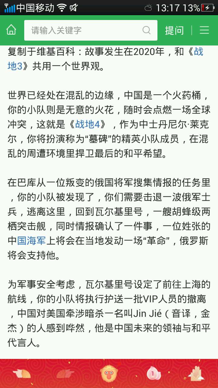 2016-02-09 [有回复] M823PC版的战地4里居然说中国人民解放军是邪恶解放军要攻占世界,而战地2又说俄罗斯要攻占世界,我只想说,EA公司是美国的,战地里美国每次都是正义的一方,现实中也是如此么?战地4已经被封了,我认为做的对,EA公司知名度高就可以随意吗?游戏做的好就了不起了吗?这种做法是侮辱国家的行为,EA公司应该被告。