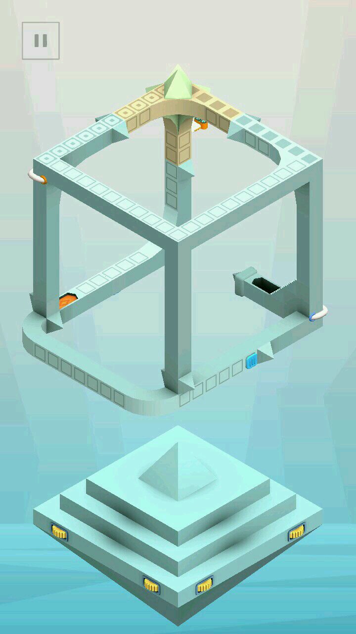 作为由纪念碑谷得到灵感的游戏,肯定是要和纪念碑谷进行对比的,游戏制作者可以说还是十分尽力的,在画风与关卡模式中都十分的有纪念碑谷的风格,而且还加入了一些自己的创意元素,希望能够有创新,难度的话并没有很大,可能有些地方会卡关也只是转不过弯而已,但是这个游戏依旧比不上纪念碑谷,也不能够给人一种希望继续玩下去的渴望,主要可能有bgm原因吧,纪念碑谷的配乐十分的赞,移动机关的响声就像叮当泉水一样清脆~而这款游戏的BGM就不怎么好听了_(:з」∠)_