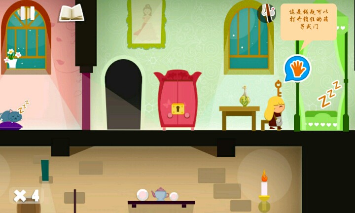 灰姑娘的冒险:制作礼服【温馨提示:在拿到卷尺之前速度可以加快4】速度4——钓鱼钩——2楼——继母房间钥匙——1楼——宝箱拿到鱼——2楼——姐姐房间——速度1——给猫喂鱼——爬上楼梯——在猫叫声结束之前用钓鱼钩调到卷尺【注意:猫吃完鱼会叫 姐姐听见猫叫会转过头去看猫 要在猫叫声结束之前拿到卷尺 不然会被姐姐发现】——楼梯上拿到钥匙——到继母房间——打开衣柜门——拿到针线