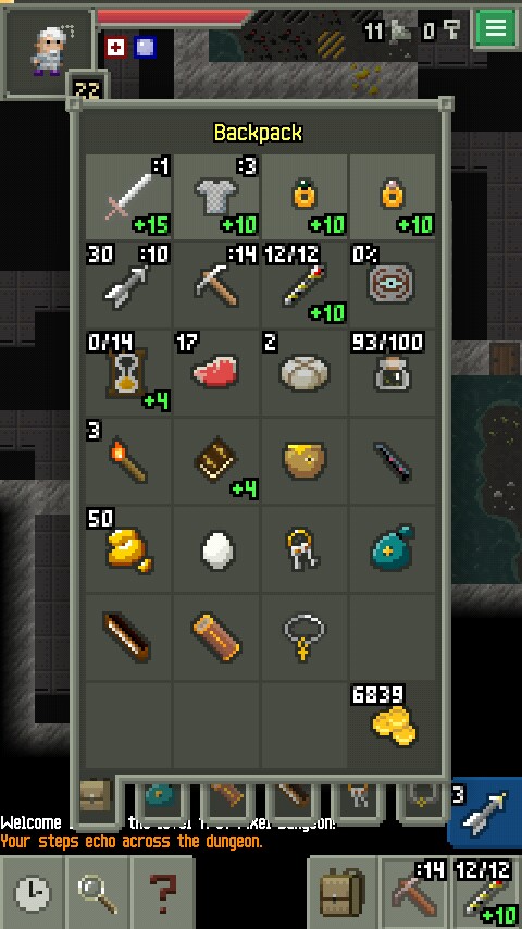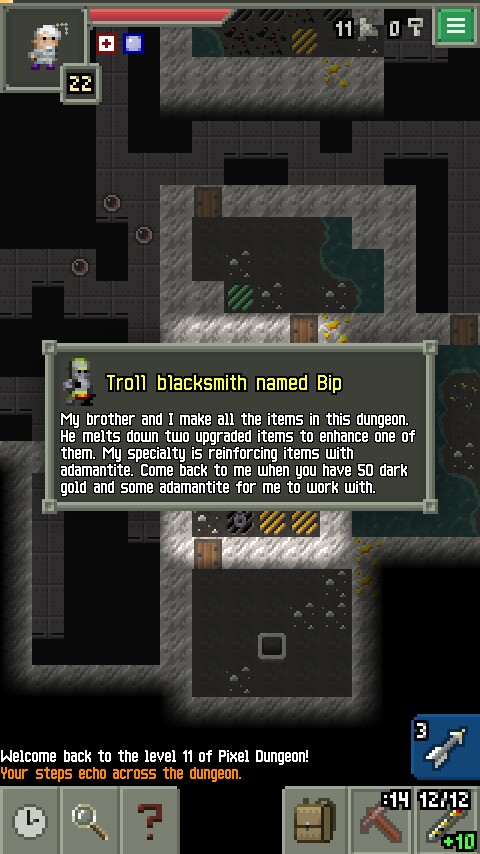 游戏难度比以前增加了不少,怪物和Boss(尤其是第三层的DA-300和两个机械人召唤机)更是强到变态。。。〒_〒,还好那个露水瓶能强化装备,我的英语水平也还凑合,加上我人品好(地牢里道具都是随机刷出来的)才能两次通关O(∩_∩)O,不信看图。总之要好好利用露水瓶强化装备,第二层给老头蘑菇后选“Draw out the dew”后打怪会爆出魔法露珠,在地牢越深处强化上限越高,在隐藏关卡:地下森林、地下骷髅城(有骷髅王)、盗天狗(Teng,第二层Boss)老巢(有一个藏宝室)、地下海滩(有蟹王)和地下黄金城(有飞空大盗)里的怪都会掉魔法露珠,打倒一定数量的小怪就可以挑战上述隐藏Boss(都掉能高级强化装备的远古武器,找两个铁匠用50个暗金矿强化)。不多说了,看我的截图吧。