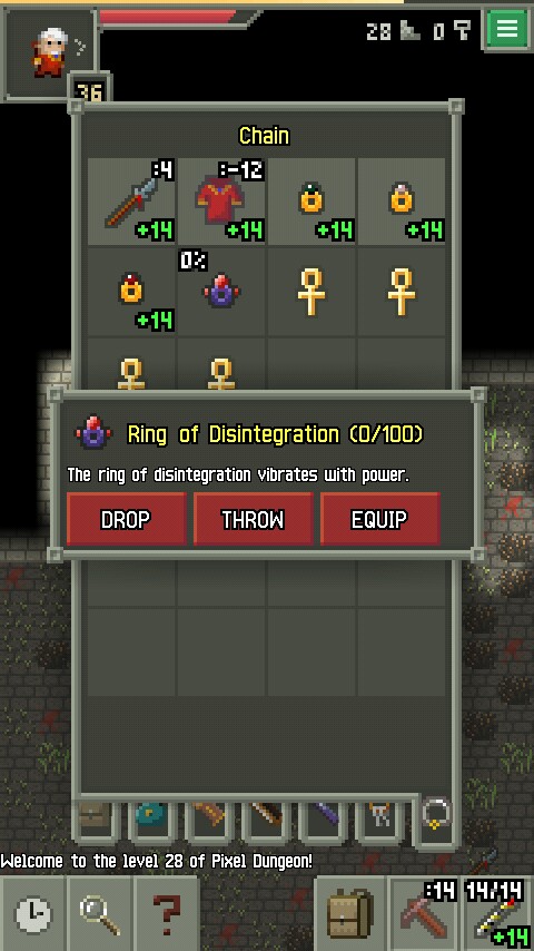 游戏难度比以前增加了不少,怪物和Boss(尤其是第三层的DA-300和两个机械人召唤机)更是强到变态。。。〒_〒,还好那个露水瓶能强化装备,我的英语水平也还凑合,加上我人品好(地牢里道具都是随机刷出来的)才能两次通关O(∩_∩)O,不信看图。总之要好好利用露水瓶强化装备,第二层给老头蘑菇后选“Draw out the dew”后打怪会爆出魔法露珠,在地牢越深处强化上限越高,在隐藏关卡:地下森林、地下骷髅城(有骷髅王)、盗天狗(Teng,第二层Boss)老巢(有一个藏宝室)、地下海滩(有蟹王)和地下黄金城(有飞空大盗)里的怪都会掉魔法露珠,打倒一定数量的小怪就可以挑战上述隐藏Boss(都掉能高级强化装备的远古武器,找两个铁匠用50个暗金矿强化)。不多说了,看我的截图吧。