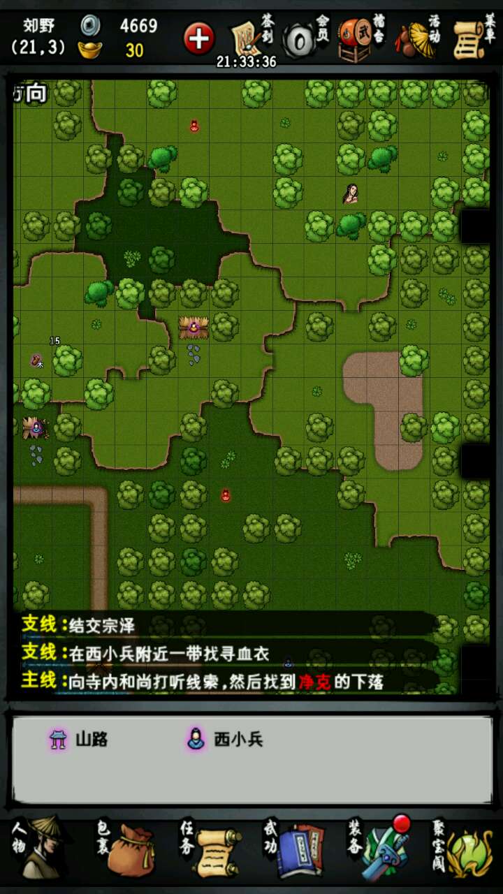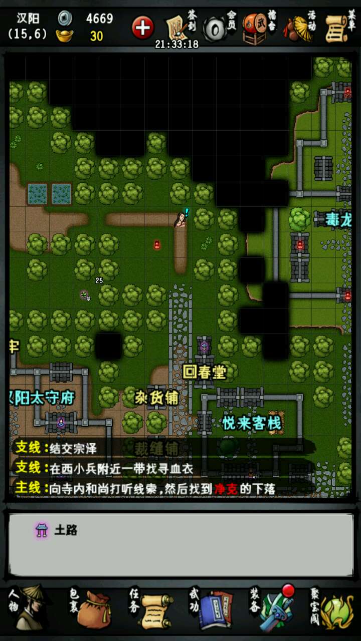 第三个任务:这个的话,沧洲没有什么任务要注意的,汉阳武馆的那个弟子任务选择爱情的话,他会让你给他造一个戒指,要十个赤铜,五个黑铁和三千两。然后后面给他后,他就是说以后会报答你的,算是提前投资那种。选择理想的话,他会让你送一封信去沧洲崔家,然后就是你简接拆了一对夫妻(我选了理想,然而日了狗了)。还有酒馆马童任务,奖一本内功。打败毒龙大BOSS后,记得在他房间搜索一下,有一本毒龙掌,C级的。没事打打狼出狼皮,可以卖钱,爆率很高。武馆木人是福利,过一段时间刷新,会出银子,阅历,修为。仵作送瓶雄黄酒,有经验,银子。打败毒龙向太守邀功后,他会问你来些目的是,鬼面崔三,升官发财,大开眼界。我选第一个,后面找到了一剑飘红,打败后领赏金。后面两个大家自寻探索。郎中每天十五练药也是福利,有银子,练满奖励一个加十点修为丹药。华山有个隐藏任务,找老太婆闲聊,她说鸡丢了,然后去旁边那个庙探索,有个狗洞,钻进去,打败王小二,获得华山剑法。找老太婆交任务还有银子。洛阳郊外,东西南北四逗比任务做了四个数字组合成十二个坐标,出来一个洞,里面一堆白骨,什么都木有,也是以后再说吧那种。酒鬼买瓶烧刀子搞定。第四个门派;我是刀法,拜了那什么门,坑比屎了,门派任务点香,一千两一根,时间又久。钓鱼,鱼竿二万两,虫子一千一条。现在才换了一本C级太虚刀法,一般般,建议拜少林,里面武功比较全面。华山,嵩山自寻探索。挂机就是打死一个怪,不要动了。然后退出。就可以了!暂时只玩到这里,说的比较乱,海含海含