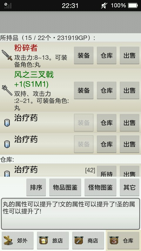 麻雀虽小五脏俱全,和大部分的RPG游戏一样,这个游戏也有商店:也就是买卖装备、补给品的地方;旅馆:自定义角色,为角色调整装备、技能,设置小队成员的地方;仓库:放置战利品,买来的物品的地方;郊外:选择所在街道(城镇),探索目的地,查看探索过程事件的地方,不同街道(城镇)可探索的地方也不一样,商店里卖的东西也不一样。