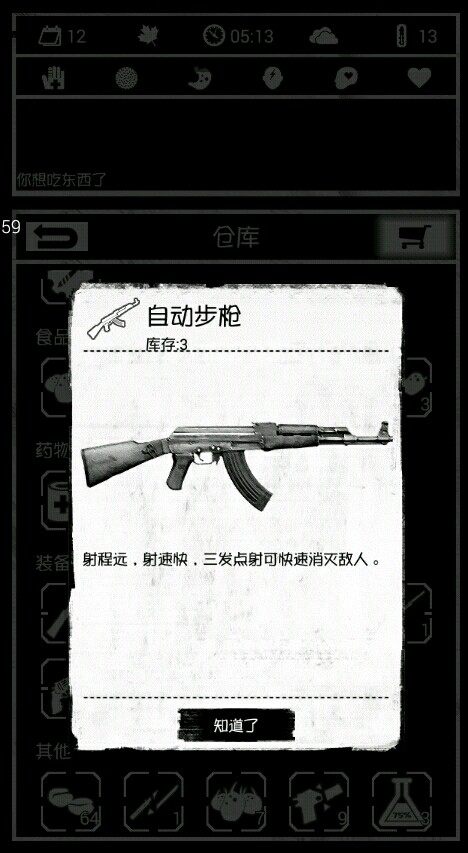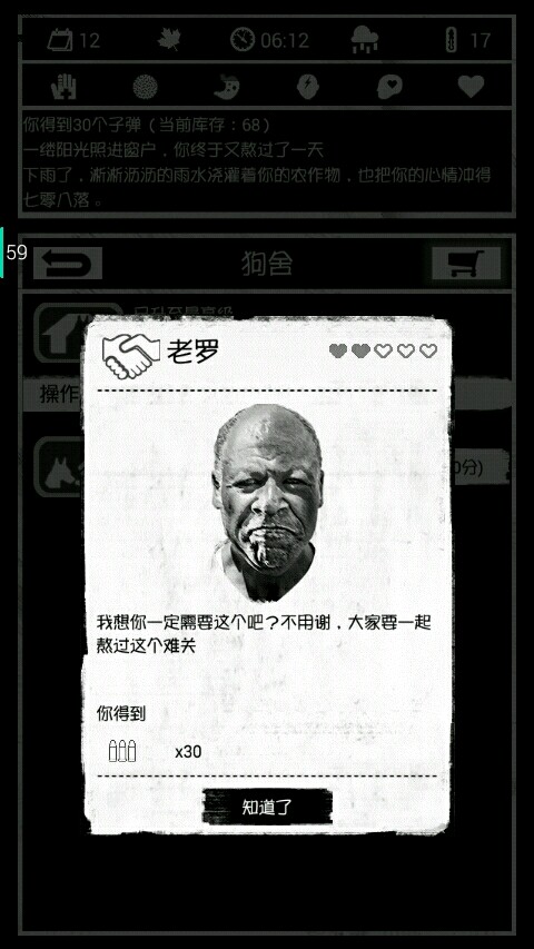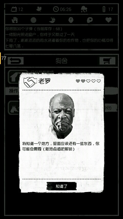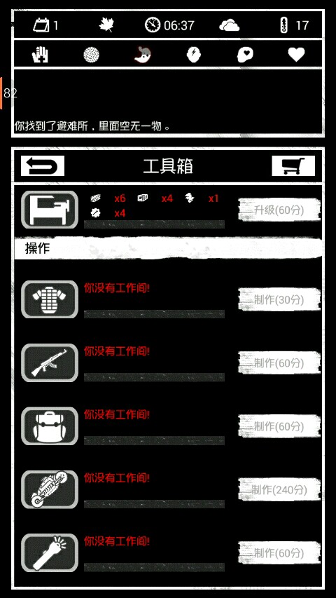 其实死亡日记要生存到100天以内或更高并没有他们说的那么难,下面给大家送上攻略(加图哦!) 首先,我们进来后就直接出去搜刮东西,注意,副本是随机掉落的!然后把最基础的斧子给做出来,做好之后再出去搜刮东西,(如果这时有搜刮到罐头的不坊吃一个)。接着你又会遇到僵尸,朽坏的僵尸要砍两斧(基本所有僵尸都只需砍两斧,只是僵尸的伤害不同),在此送上我自己的建议,搜刮东西时尽可能多拿木质材料与金属材料和柔质材料与其他没有重量的东西,(如子弹和咖啡豆)。争取先把栅栏做好,再按先后顺序尽量先做鞋子,然后有多余材料再做枪,(注意,后期会有一个叫老罗的人来叫你给他一些物资,如果实在没有也可以不给,但是尽量与他和后期的金医生搞好关系,老罗会给你子弹,医生会给你绷带或药水!)然后尽量把灶台和野兔陷阱和温棚做好,然后多搜刮点木质材料(即木头),这样吃的就基本可以不用但心了。然后就把蒸馏器与火炉做好,因为后期室内温度会降低,没火炉不行!行了,多说无益,发图!