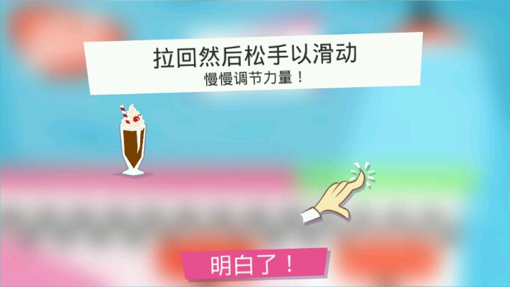 游戏玩法就是通过蓄力使杯子到达指定位置(绿色的地方)如果蓄力太小就会重来一遍目前的星级,但是蓄力太大,杯子摔碎就会扣掉星级,重来本关卡,每个关卡都在星级的,一定要把握好力度,拉的时间越长,力度越大,你们看着办,哈哈哈,游戏的食物(也就是奶昔类型)是需要到达指定关卡才会解锁。