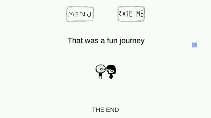 首先把左拖或右拖把正确的背景拖出来,连按跳跃键,把左键震下来,放到对应位置,然后右上暂停,拿到右键,捡起钥匙向左走,进去下一个房间,挪动方块,回到前面房间,捡起钥匙,然后继续走,记得把方块推回去,不然跳跃距离不够,然后把钥匙放在按钮上,进入上面,如果是白屏就把手机亮度调最低,黑屏就调最高,手拖动钥匙开门,用钥匙垫在脚下跳上去,走到门处,手机左右屏幕是通的,把钥匙甩过去,压住按钮,不开门的地方用手按住not,不让通过的地方用钥匙把自己推过去,倾斜手机把墙砸开,用钥匙敲开右上角裂缝,把钥匙拖出外面,一直拖到第二个按钮压住(顺便说下,可以一直向右拖,全是小彩蛋),二段跳用两个手指点跳跃键,然后声音调到最大,锁屏(不好使多试几次)把火拖到报警器上面,跳到花盆上,调节太阳(右边是变小,左边是变大)跳到右上边缘,拿到钥匙后跳回来,不要一直走,站到屋子钱,在没有太阳的时候进入屋子,时间调到2016年以前,用女友压在开关上,自己头顶着墙,然后两人一起过去,然后自杀,把尸体推到脚下垫脚,跳到上面用刺压住开关,两人一起下去,先跳到刺的中间部分做垫脚,然后两人跳过去,,拿到钥匙后回主菜单点share,回来后继续走,把字拖到空中垫脚跳过去,先向左上跳一下,然后从棚顶跳过去。这关说明一下,女的只能用左键和跳跃键,男的只有右键,先用女的跳到男的头上,然后向右走,跳到平台拿钥匙,男的自杀后,女的走到男的头上在向右走,然后女的走到门上,两人一起掉下去,然后女的现在男的头上跳过去按按钮,男的去吧石块推过去,然后女的掉下去(摔死那对狗情侣),男的继续向左走,点击屏幕出现垫脚石跳过去,倾斜屏幕改变角度走过去,一直不动等刺消失后走过去,左右键一起按,门打开,狂点三个按键把按键点碎,重力把自己飞过去,一周目完成