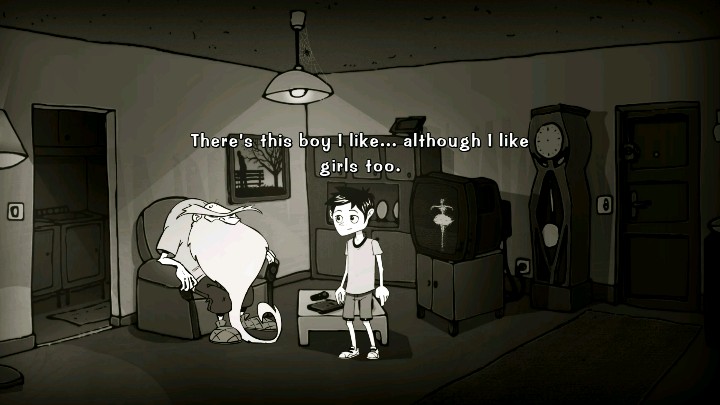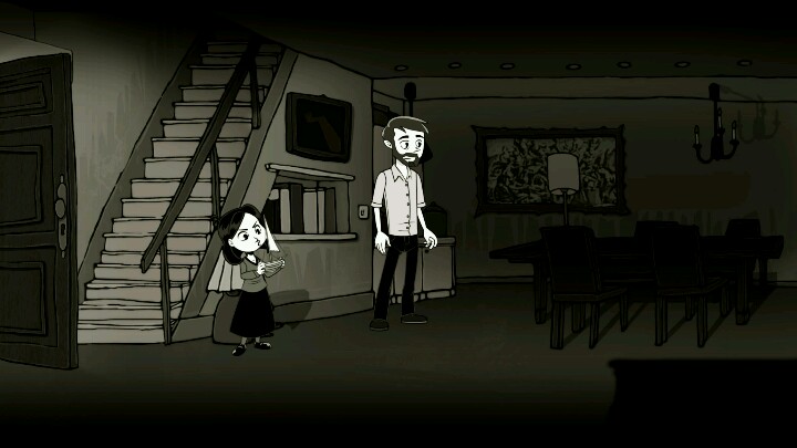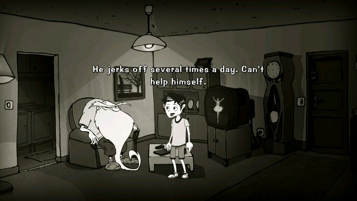 先进入的是living room,可以取下家门右边挂着的钥匙。桌边两位aunt在玩牌。living room左边的photo lab里是dad,右上的是主人公卧室,右下是哥哥Bruno的房间,右边两个房间相通。和所有人物依次对话。