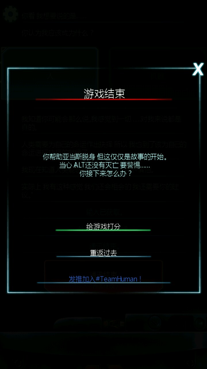 通关了,感想也很多。作为生命线的新作,非常不错。也考虑了一些事情,没错,我在最后结尾的时候确实很想同意西贝柳斯博士的想法,也想让亚当斯这么做。但我明白一件事,人类的前进的一步和一个人生命比起来当然更重要的多,但是难道为了人类前进而牺牲一条生命?哪怕他是机器人?不,我无法做到,即使是机器人也应该有人权,某些人有它存在的价值和意义,不能为了自己的私心而把人类前进的脚步当做借口,人性是有很多缺点的,有时候我们或许更向往机器人那样按照指定的程序工作,但是机器人终归是机器人 他没有思想和感情,他只能是人类制造出来的工具。在最后,亚当斯问我他应该成为人还是机器人,我毫不犹豫的选择了人,没错,思想和情绪才是成为人的基础,离开了这些,那只是一副空皮囊。