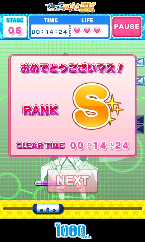 这个《1000酱的方块冲撞DX》是一款球球反弹消方块的游戏,如果你认为这只是一个很简单,很普通的小游戏,那你就错了。这款游戏有以下几大特点。1、有可爱的小萝莉( ̄▽ ̄")Ъ!2、有动听带感的bgm( ̄▽ ̄")Ъ!3、有福利( ̄▽ ̄")Ъ!4、界面简单明了( ̄▽ ̄")Ъ!但这游戏也有很大的坑爹之处:5、十分鬼畜的关卡 (۩⊙o⊙۩)我选择死亡6、操作时,触控有重力并存 (ಥ_ಥ)是在下输了7、等级获取设定很坑爹 ( •̀⊿•́)ง110我要报警了!最重要的是它的难度难到会让你萌发N种想砸手机的冲动!!!!!!这游戏想得到S级,必须要在一定时间内三命通关。每一关卡内都会有一些特别之处,你利用它可以更容易的获取s级。玩这游戏最重要的是有运气,有实力,还要有钱(因为你可能会随时砸手机)要想成功,请记得在一定时间内完成哦。我玩了一晚上才玩到了5个S.·´¯`(>▂<)´¯`·.鱼,好大的鱼,虎纹鲨鱼~♪