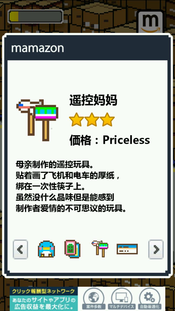 一开始看到mamazon就想到了amazon,果然啊,这名字是这么来的(顺便说一下,游戏开始页面的那只说着“猫田”的小猫,点击的话就是游戏《猫咪田园》的googleplay下载地址)本以为是《她最后如是说》那样的解谜游戏,居然是收集……不过还好,剧情目前很感人。