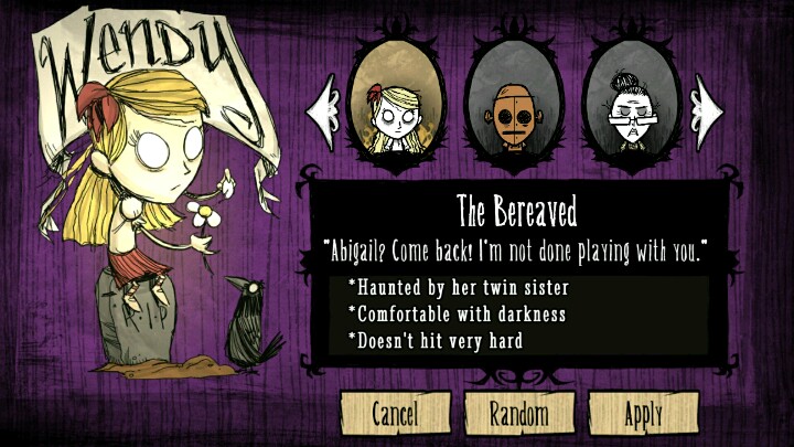 有个幽灵姐姐叫阿比盖尔,算是一个打手吧。阿比盖尔会保护温蒂,在晚上杀死任何敌对小怪,但是当温蒂太接近时,阿比盖尔也有可能会藉由触碰伤害到温蒂。她姐姐会在黄昏出现。貌似后来还设定了血量